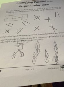 Today we identified Parallel and perpendicular lines Parallel lines don’t connect but are still the same. Perpendicular lines do connect in one place at a right angle.